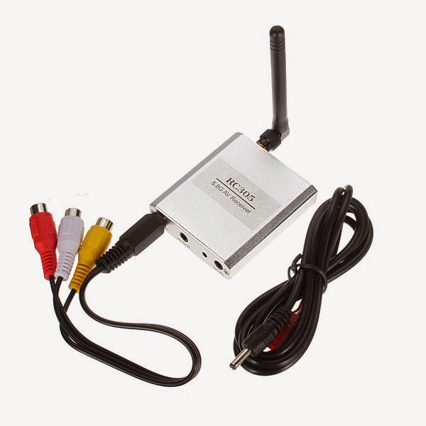 Once removed from it's heavy casing, it's small and lightweight. We just connect the 3.5mm jack plugs from the RC305 to the mini DVR, and make another power link to the 3s lipo that powers the monitor.